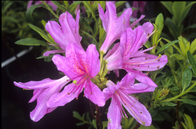 Азалия гибридная Орчид Лайтс - куст высотой до 120 см, компактный, с многочисленными тонкими побегами и сизоватой листвой. Зацветает раньше других сортов серии и цветет короче. Цветки некрупные, сиреневые. Исключительно зимостойкий сорт.