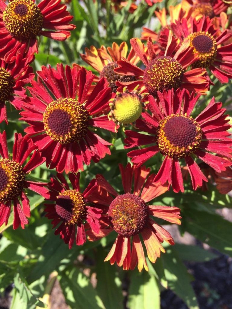 Гелениум гибридный Сиеста: Компактный низкорослый сорт высотой 45-50 см. Очень хорошо подходит для срезки. Устойчив к мучнистой росе. Цветки тёмно-красные с тёмно-коричневым конусом. Лепестки слегка волнистые. Цветоносы прочные, ветвистые. Цветение в июле-сентябре. Высота 50-60 см. Не терпит засухи. Место солнечное. Почва увлажнённая, дренированная. Зона 4 (до -29ºС).