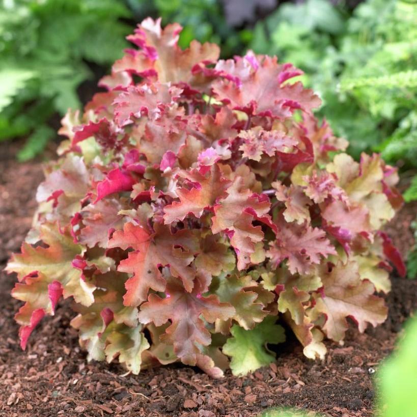 Гейхера гибридная Мармелад (Marmalade) поражает удивительной окраской и формой листвы – гофрированные резные листья пестрят красными, зелеными и оранжевыми тонами. И без того эффектный вид летом дополняется мелкими кремово-желтыми цветочками, собранными в соцветия-метелки. Этот сорт отлично сочетается с другими декоративными растениями. Гейхера гибридная Мармелад (Marmalade) предпочитает полутень, но также ее можно высадить на открытых солнечных участках. Поливать растение следует по мере высыхания почвы. Переизбыток влаги может стать причиной развития гнили и болезней.