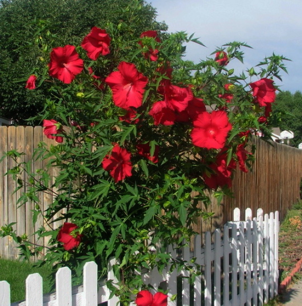 Саженцы Гибискуса Шаровая молния относятся к новой группе морозостойких сортов. Это растение является многолетним, отличается своей силой и стойкостью к различным заболеваниям. Его крупные листья, похожие на листья клена, темно-зеленого цвета отливают красноватым оттенком. Сами соцветия в диаметре могут достигать тридцати сантиметров, обладают ярчайшим красноватым цветом, более темным в сердцевине. Расцветает этот сорт в середине лета, покрывая аккуратный куст эффектными бутонами. Саженцы гибискуса Шаровая молния очень чувствительны к влаге, нуждаются в периодической подкормке и удобрении почвы.