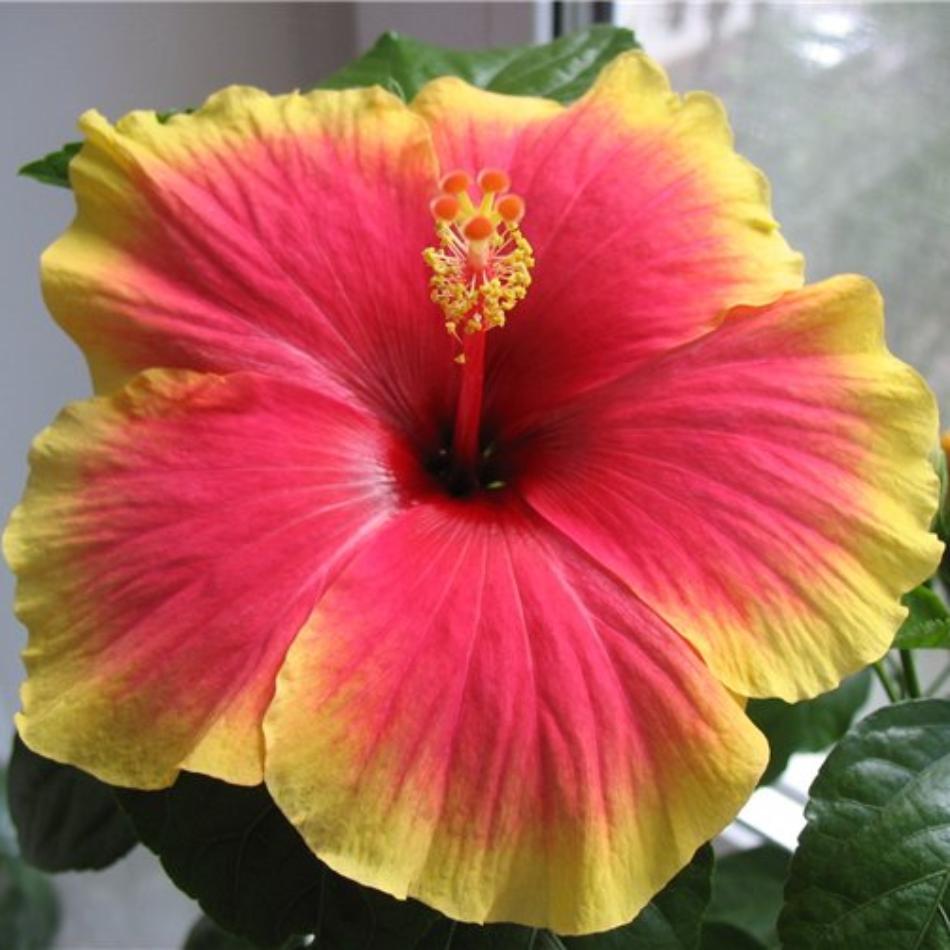 Гибискус Tivoli. Отличительной особенностью является мощный, быстро деревенеющий ствол. У этого сорта большие (до 15 см в диаметре) отогнутые назад красные немахровые цветы с желтой каймой по краю. Четко выражены рельефные прожилки на лепестках. Листья с прошлогодних веток осыпаются, остаются длинные одеревенелые палки с зеленью и цветами на концах, кустик теряет привлекательность. Раз в 2-3 года гибискусу требуется обрезка.