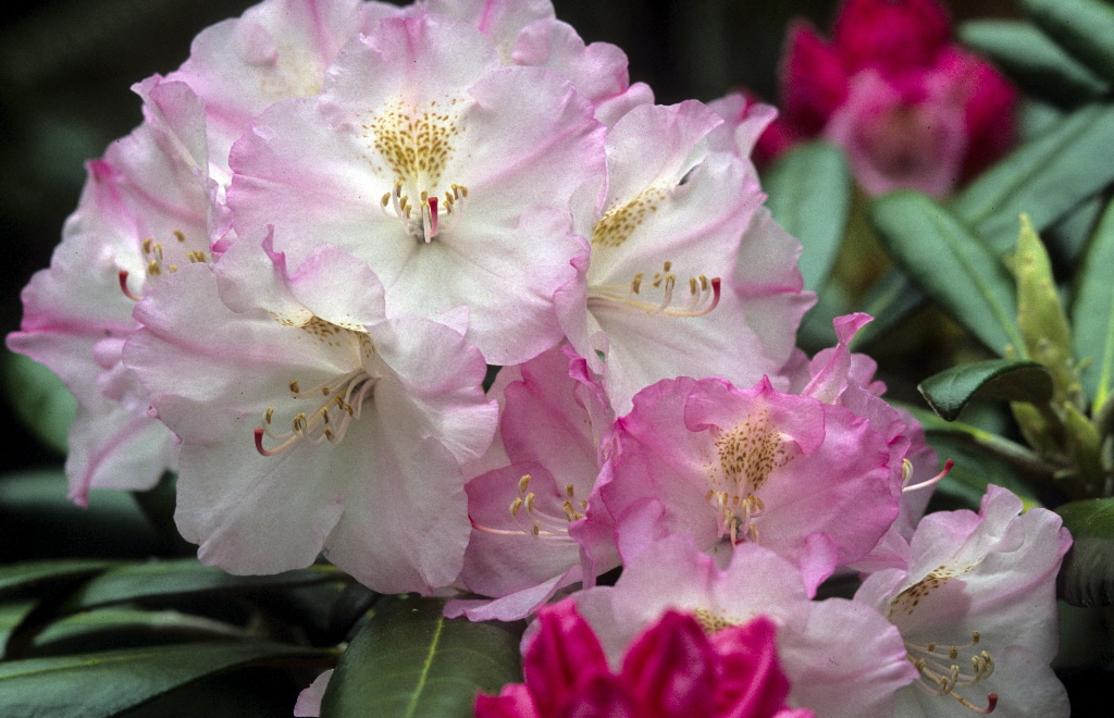 Рододендрон Ken Janeck - сорт вечнозелёных рододендронов. В возрасте 10 лет высота 70—121 см, ширина от 110 см. Крона плотная, ширина, как правило вдвое больше высоты. Листья 125?25 мм, относительно узкие, ланцетные, тёмно-зелёные, на конце заострённые, с густым сливочным-коричневым опушением. В соцветии до 11—17 цветков. Бутоны розовые. Цветки 75 мм в ширину, открыто-воронковидные, бело-розовые выцветающие до белого. Аромат отсутствует. Среднего срока цветения, в Германии цветёт в мае.