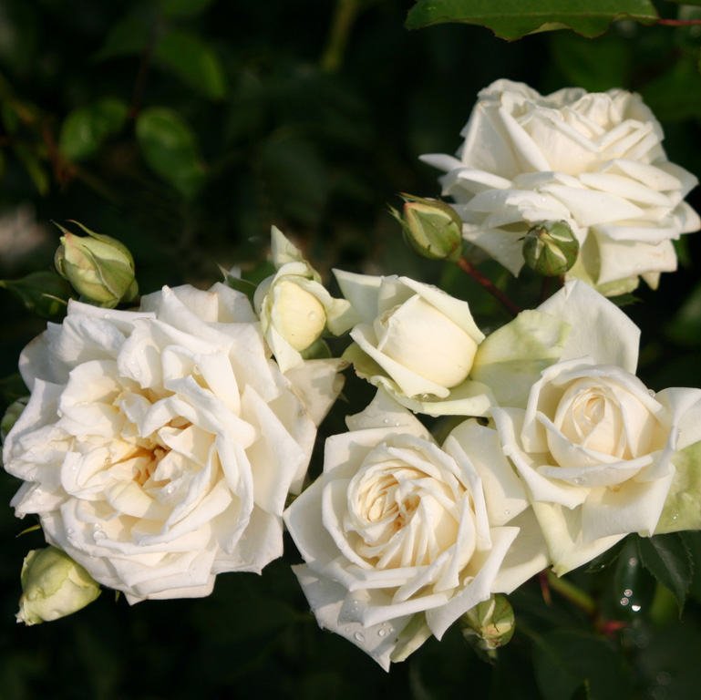 Роза Ilse Krohn Superior - цветки ярко-белые со сливочным оттенком в центре, лепестки элегантно загибаются. Достигают 13-14 см в диаметре, густомахровые, с высоким центром, раскрываются из элегантных бутонов в кистях по 3-5 шт. Растение хорошо выдерживает дождь. Куст очень выносливый, сильнорослый, до 3 м. Для холодного климата это без сомнения лучшая белая плетистая роза.
