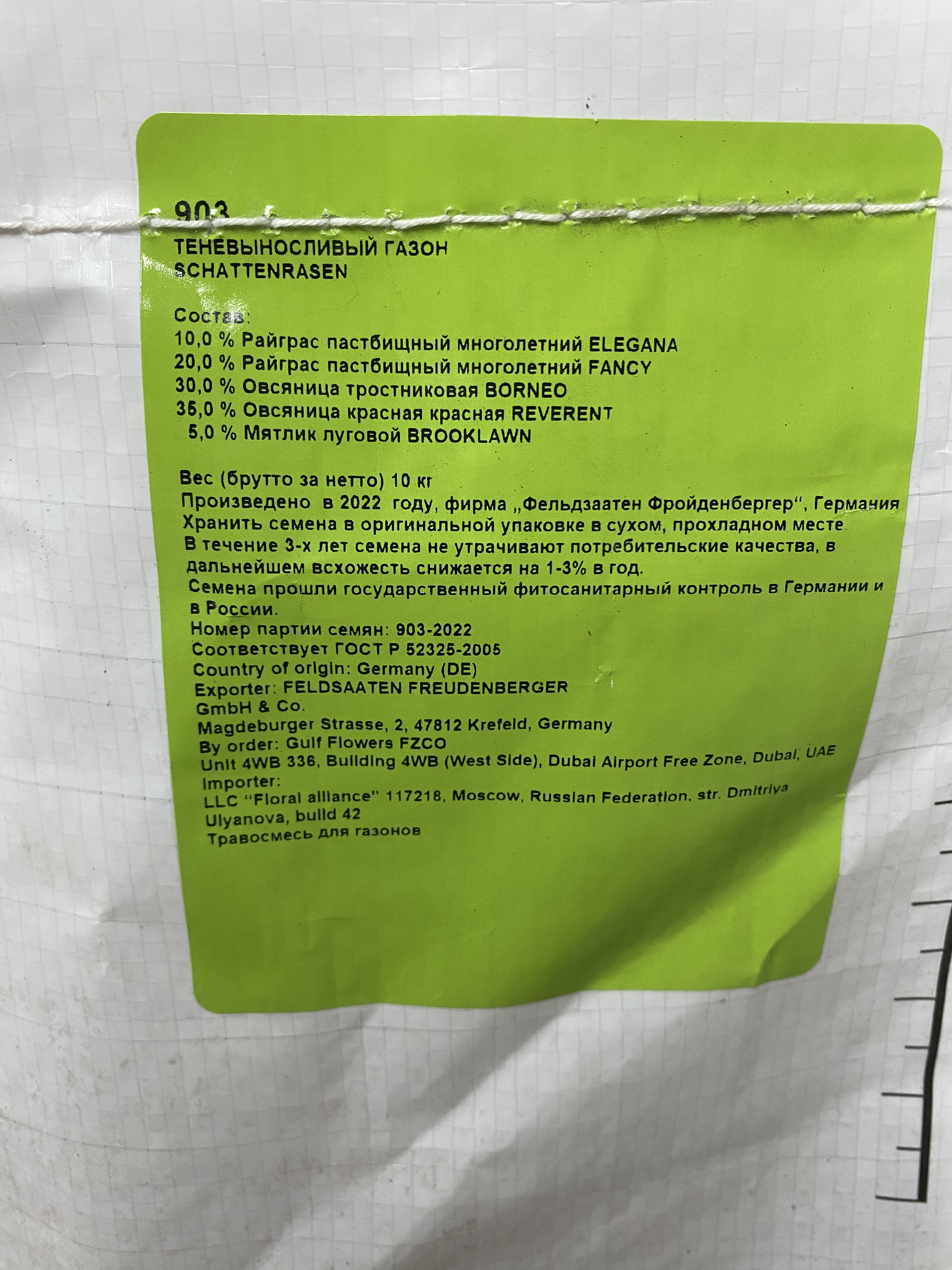 Состав: 10% Райграс пастбищный многолетний ELEGANA, 20% Райграс пастбищный многолетний FANCY, 30% Овсяница тростниковая BORNEO, 35% Овсяница красная REVERENT, 5% Мятлик луговой BROOKLAWN. Производитель: Фельдзаатен Фройденбергер (FELDSAATEN FREUDENBERGER). Страна: Германия. Дата производства: 2022 г.