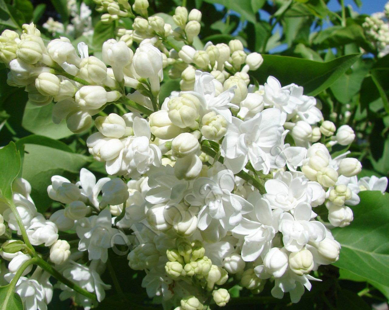 Сирень Jeanne d'Arc - один из самых популярных сортов сирени. Куст компактный высотой до 2,5 м. Бутоны кремово-желтые, цветы белоснежные, махровые, до 2 см в диаметре, с нежным ароматом. Соцветия красивой, узкопирамидальной, иногда почти цилиндрической формы, до 18 см длиной. Одно соцветие состоит из 600 цветков.