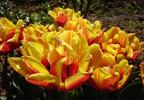 Тюльпан Double Focus - махровый поздний сорт. Высота растения 40 см. Цветение продолжительное, в апреле – мае. Яркая праздничная расцветка отличает этот сорт. Лепестки алые с желтыми полосами по краям. Сорт хорош в срезке, отличается высокой зимостойкостью.