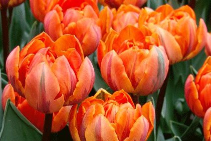 Тюльпан Orange Princess - очень яркий, поздний сорт. Высота растения 35-40 см. Листья зеленые, однотонные. Цветет в мае. Цветок очень крупный, диаметром 8-10 см, яркий и привлекательный, густо-махровый, пионовидный, красновато-оранжевый, с темно-красными всполохами снаружи лепестков.