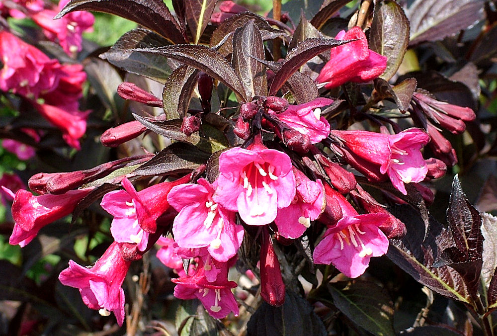 Вейгела цветущая Alexandra – многолетний кустарник до 3 м высотой и 1 метр в ширину с пурпурными цветками, собранными по 3-4 штуки в соцветия. Цветет обильно, начиная с конца мая-начала июля в течение 20-25 дней. Ее родина – Северный Китай и Япония. Этот сорт также именуют Wine and Roses. Листья у цветущей вейгелы с коротким черенком, почти прилеплены к веткам, заостренные на конце. Почвы любит щелочные, рыхлые, с перегноем. Прикорневое место нужно на зиму засыпать измельченной корой или опилками слоем в 10 см. Сам куст нужно стянуть веревкой, прижать к земле и присыпать листьями. При выращивании нельзя допускать пересыхания: нормой полива является 8 литров воды на 1 куст. Поливы надо начинать сразу после таяния снега, если зима была не снежная. Нуждается в фосфорно-калиевой подкормке во время формирования бутонов.