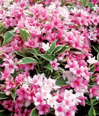 Вейгела цветущая Nana Variegata - кустарник декоративнолиственный, красивоцветущий, шаровидный, компактный, достигает высоты 1,5 м и около 2 м в диаметре. Цветки красивые, крупные, трубчато-колокольчатые, бело-розово-лиловые или малиновые, собраны в соцветия по 3–4 штуки. Цветёт обильно, длительно. Листья короткие, эллиптические, с заостренной вершиной, зазубренные по краям, ярко-зеленые с бело-кремовой каймой. Морозостойкий сорт. Продолжительность жизни - 30 лет.